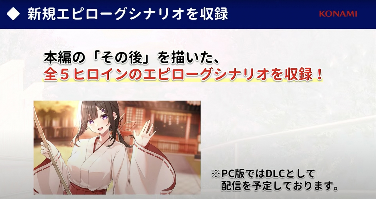 また、フルボイス化だけではなく、新規エピローグシナリオの追加も行われるとのこと。追加エピローグシナリオは、Steam版では有料のDLCとして配信されるそうだが、各ヒロインの新たな魅力を見られるものになりそうだ。