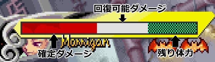 緑色の部分が残り体力、赤が食らっているダメージですが、白が回復可能ダメ―ジ(通称:白ゲージ)で、この部分は時間経過で自動回復して残り体力に戻すことができます。【通常ダメージ+白ゲージ】が体力バーの端まで届くとダウンとなり、コウモリを一本取ることができます(コウモリ=ラウンドで、2本取られたらその試合に敗北する)。